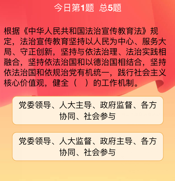 1、根据《中华人民共和国法治宣传教育法》规定,法治宣传教育坚持以人民为中心、服务大局、守正创新,坚持与依法治理、法治实践相融合,坚持依法治国和以德治国相结合,坚持依法治国和依规治党有机统一,践行社会主义核心价值观,健全( ) 的工作机制。