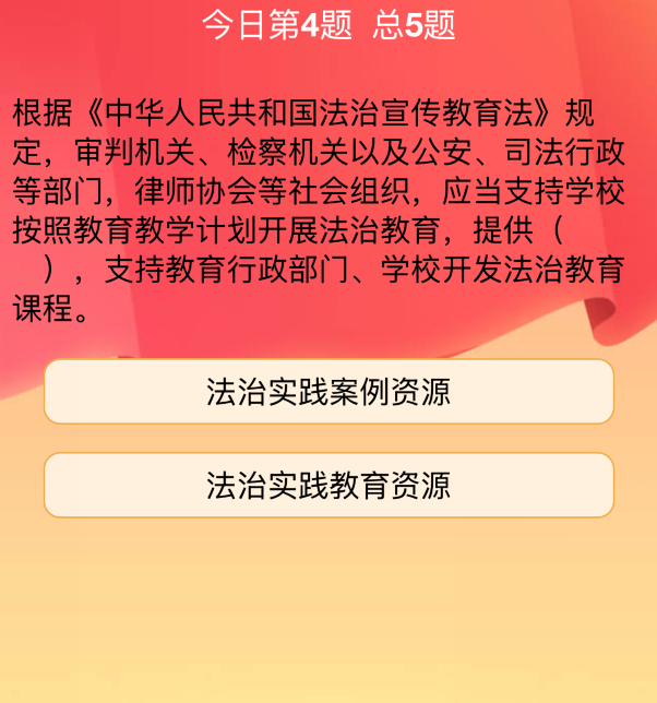 4、根据《中华人民共和国法治宣传教育法》规定,审判机关、检察机关以及公安、司法行政等部门,律师协会等社会组织,应当支持学校按照教育教学计划开展法治教育,提供( ),支持教育行政部门、学校开发法治教育课程。