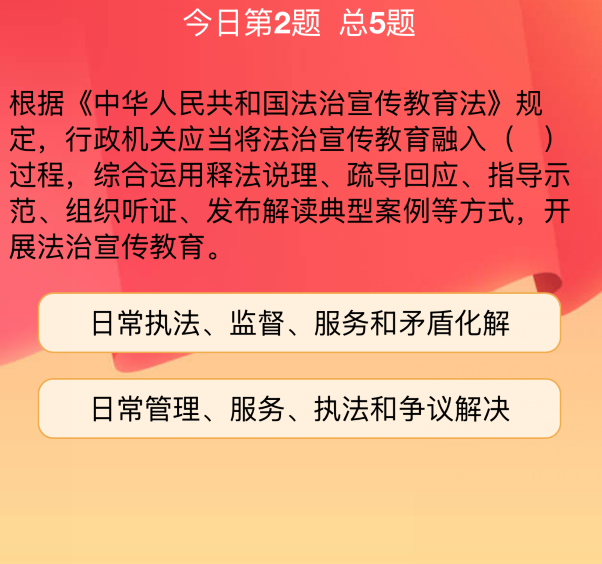 2、根据《中华人民共和国法治宣传教育法》规定,行政机关应当将法治宣传教育融入( )过程,综合运用释法说理、疏导回应、指导示范、组织听证、发布解读典型案例等方式,开展法治宣传教育。